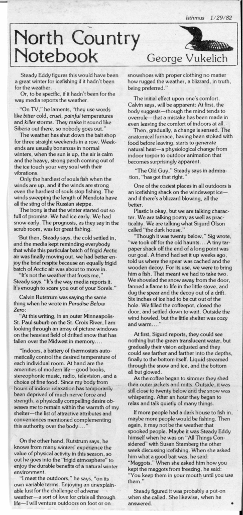 Isthmus 1-29-82: A Great Winter for Icefishing October 17, 2025 Articles and Columns by George Vukelich No Comments This column can also be found on p. 70 of North Country Notebook, Vol. I.